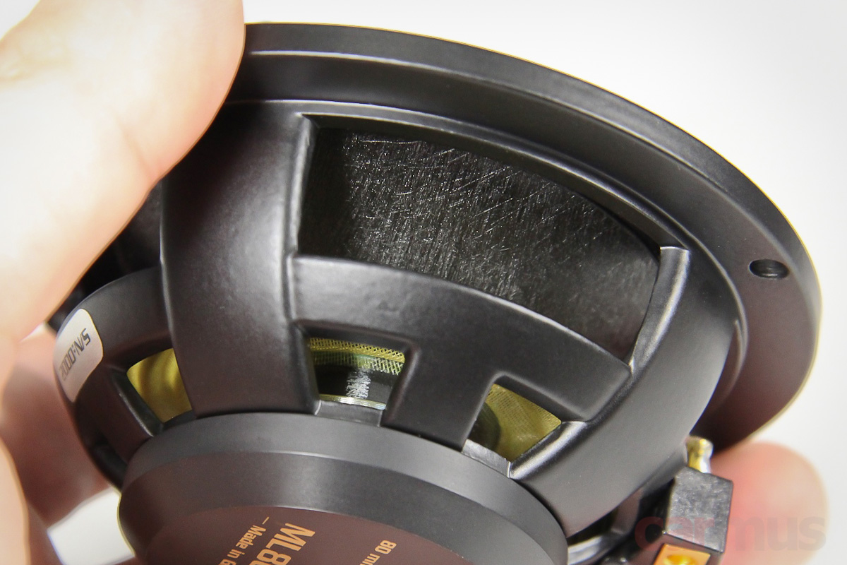 Материал, дословно, — Ultra-lightweight carbon fleece multilayer cone. Иными словами, это сложный композит с разнонаправленными волокнами. Фактура хорошо видна и с лицевой, и с тыльной сторон.