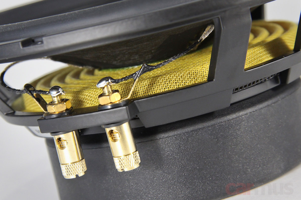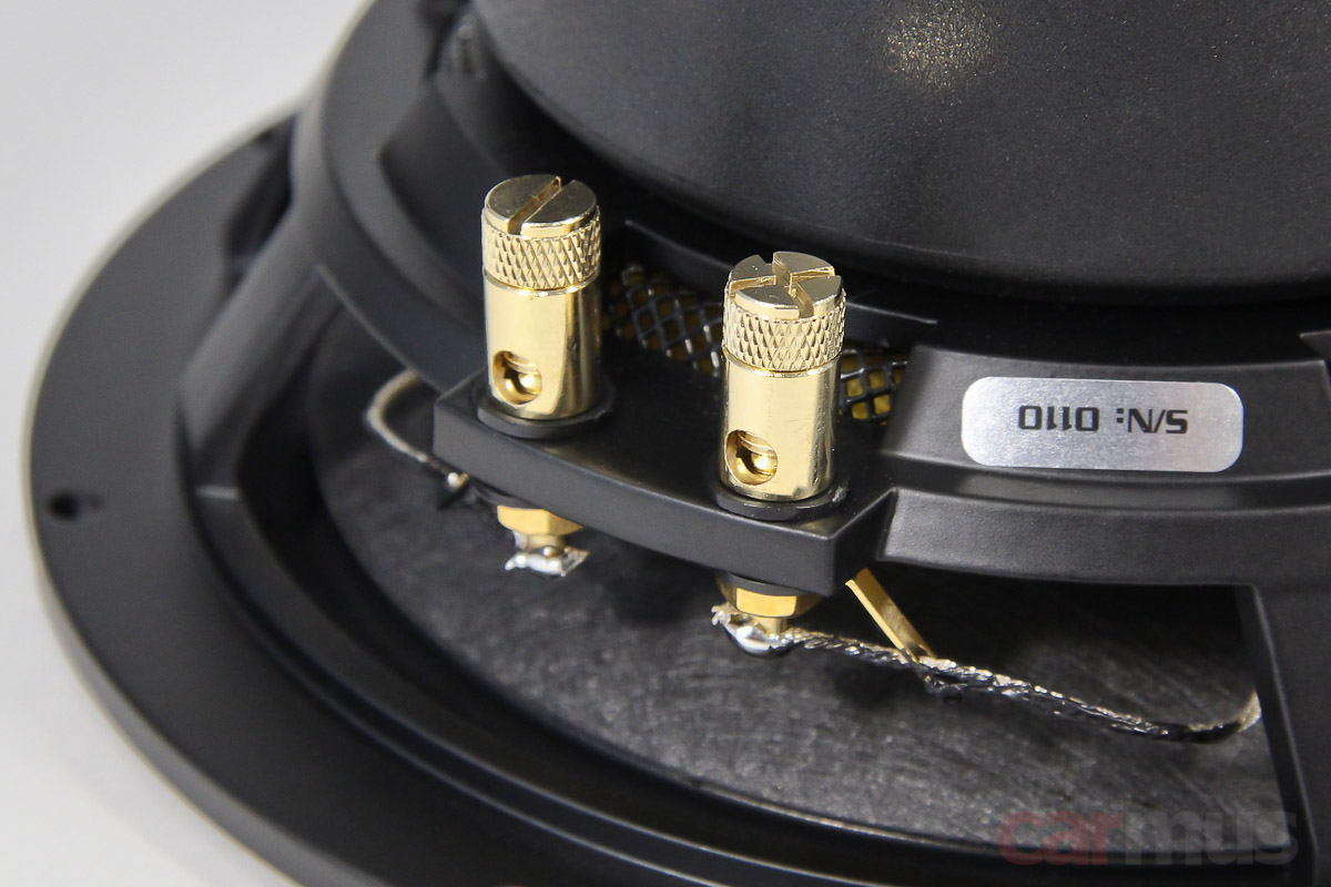 Кстати, отмечу способ подключения акустических кабелей. В отличие от большинства динамиков в Car Audio, это не «лопаточки» и не нажимные пружинные клеммы, а зажимные винтовые. Похожий принцип, кстати, больше характерен для терминалов в домашней акустике.