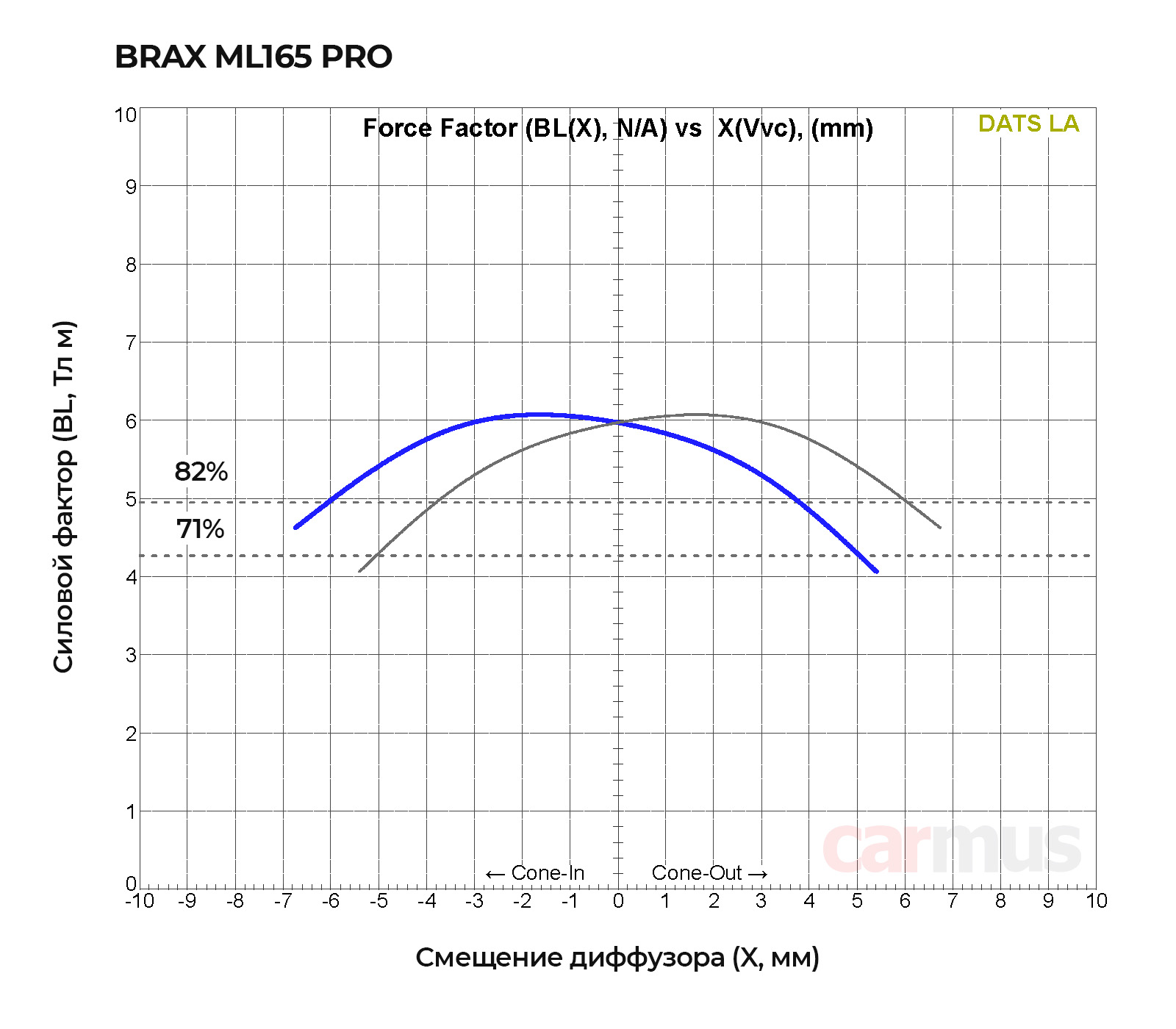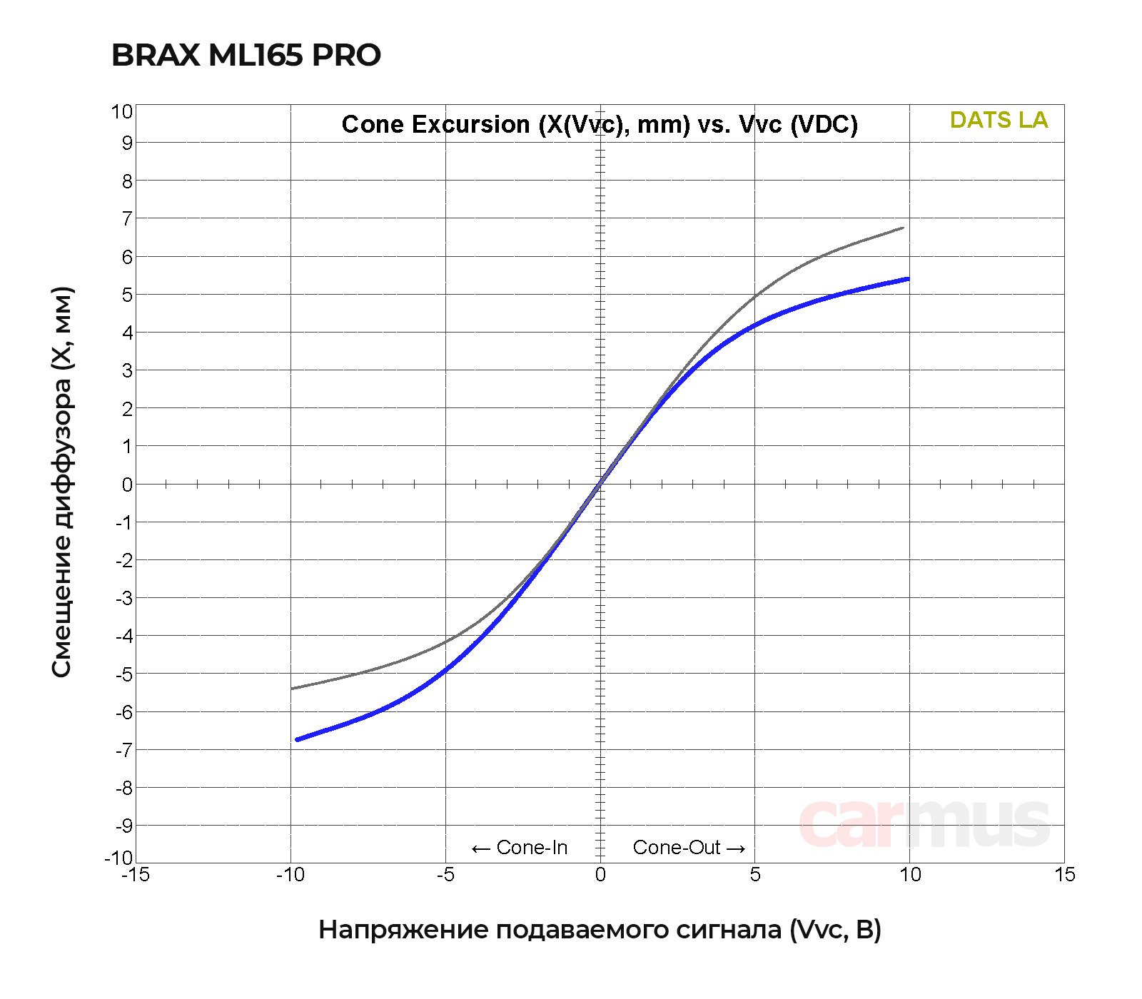 Теперь к работе магнитной системы. Тут главная особенность – весьма приличный для 6,5-дюймового калибра ход диффузора, мотор сохраняет свои силы при значительных смещениях при размахе peak-to-peak почти что целый сантиметр. Магнитное поле практически симметрично, точка наибольшего значения BL чуточку смещена внутрь мотора. Напомню, описание заявляет Xmax по 4 мм в каждую сторону, что вполне соответствует действительности.