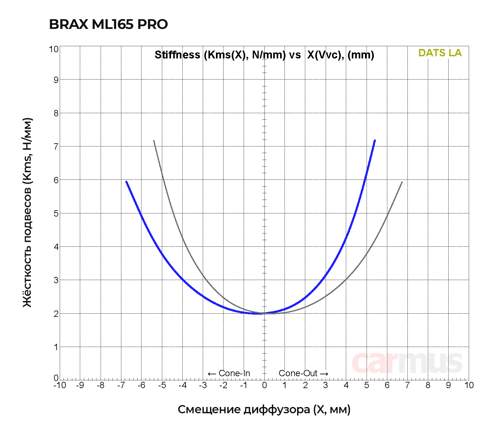 Жёсткость шайбы и верхнего подвеса почти не оказывают влияния на небольших ходах (ну как небольших, примерно до размаха 4-5 мм peak-to-peak – тоже не так уж и мало для мидбасового динамика). Дальше начинается мягкое, но уверенное возрастание жёсткости. Как видите, в этом смысле параметры подвесов вообще неплохо согласуются с возможностями моторов.
