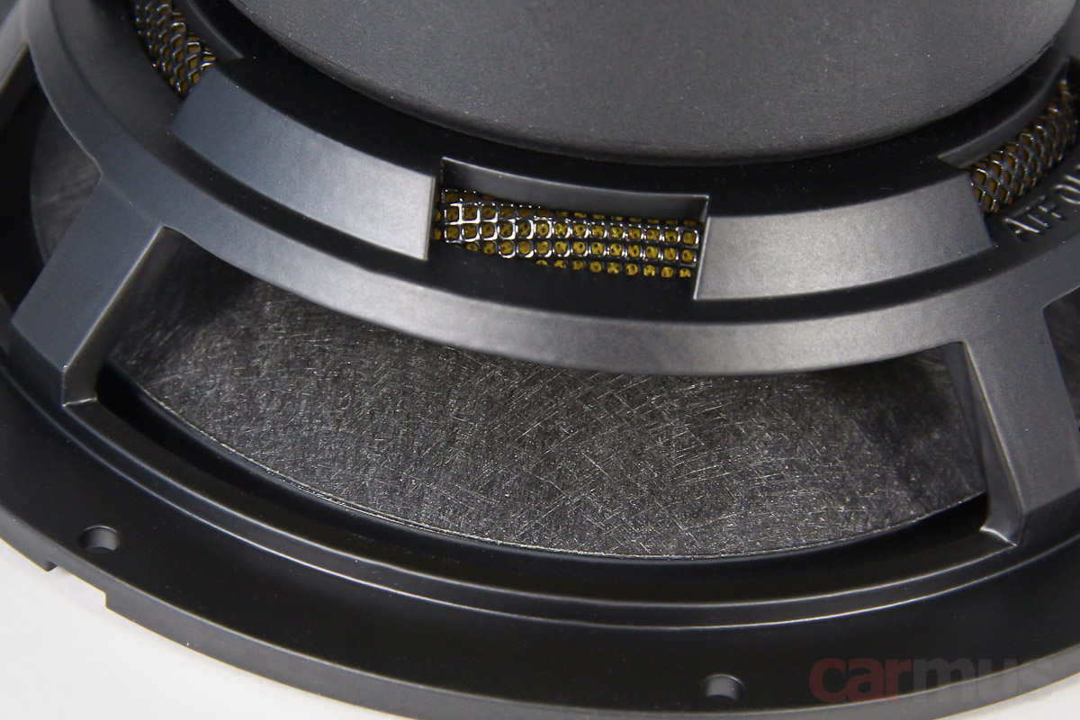 Диффузоры тут интересные, разработаны совместно с компанией Курта Мюллера. С первого беглого взгляда похожи на целлюлозные, но при ближайшем рассмотрении видна их фактура с разнонаправленными волокнами. Это сложный материал с углеволокном, в описании он указан, дословно, как Ultra-lightweight carbon fleece multilayer cone. Центральные колпачки – из плотной синтетической резины. Верхние подвесы – тоже резиновые, но уже мягкие.