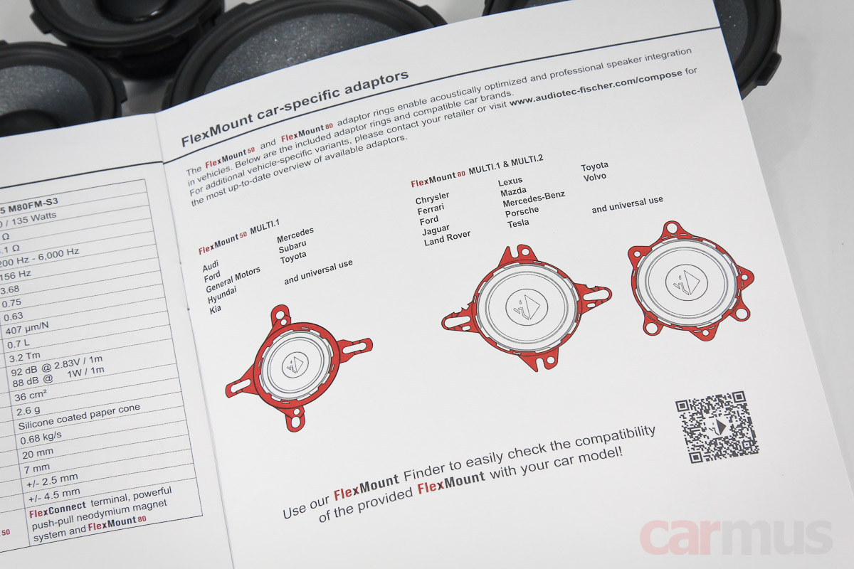 В инструкции указан короткий список автомобилей, в которые можно установить эти динамики без лишней «хирургии». И тут же есть QR-код, который ведёт на конфигуратор на сайте Audiotec Fischer — там можно подобрать варианты конкретно на ваш авто.