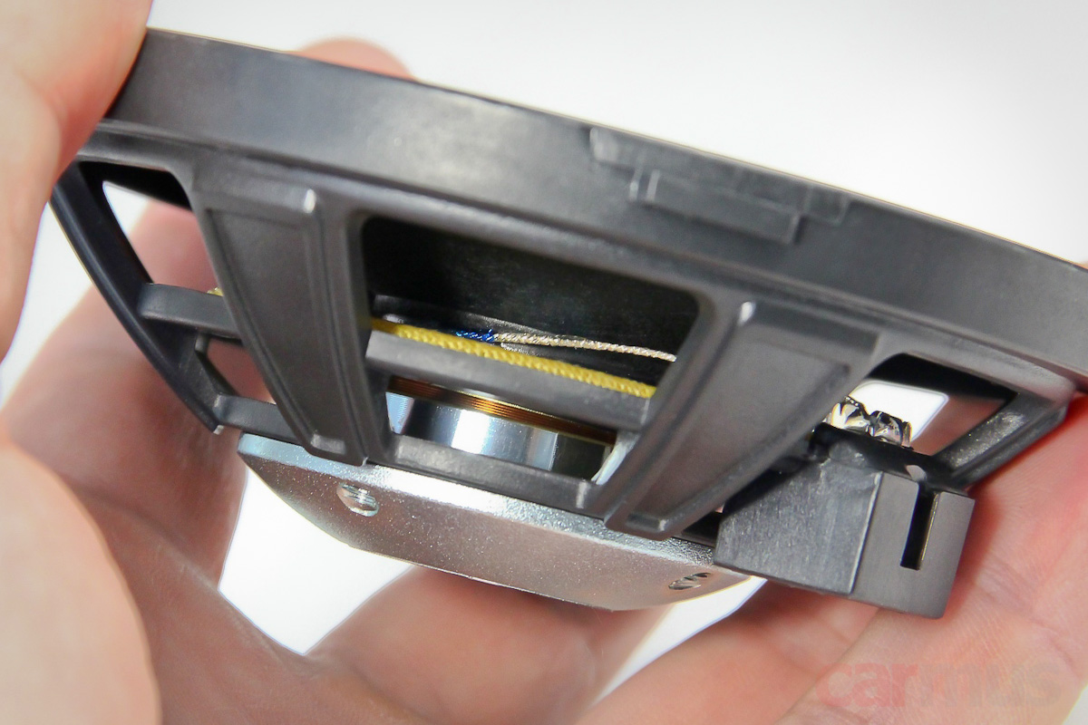 Тыльная сторона имеет характерную фактуру непрессованной целлюлозы. Несмотря на кажущуюся массивность, конусная часть диффузора не слишком толстая, да и по измерениям подвижка относительно лёгкая (по крайней мере, по меркам современных динамиков 6,5-дюймового калибра).