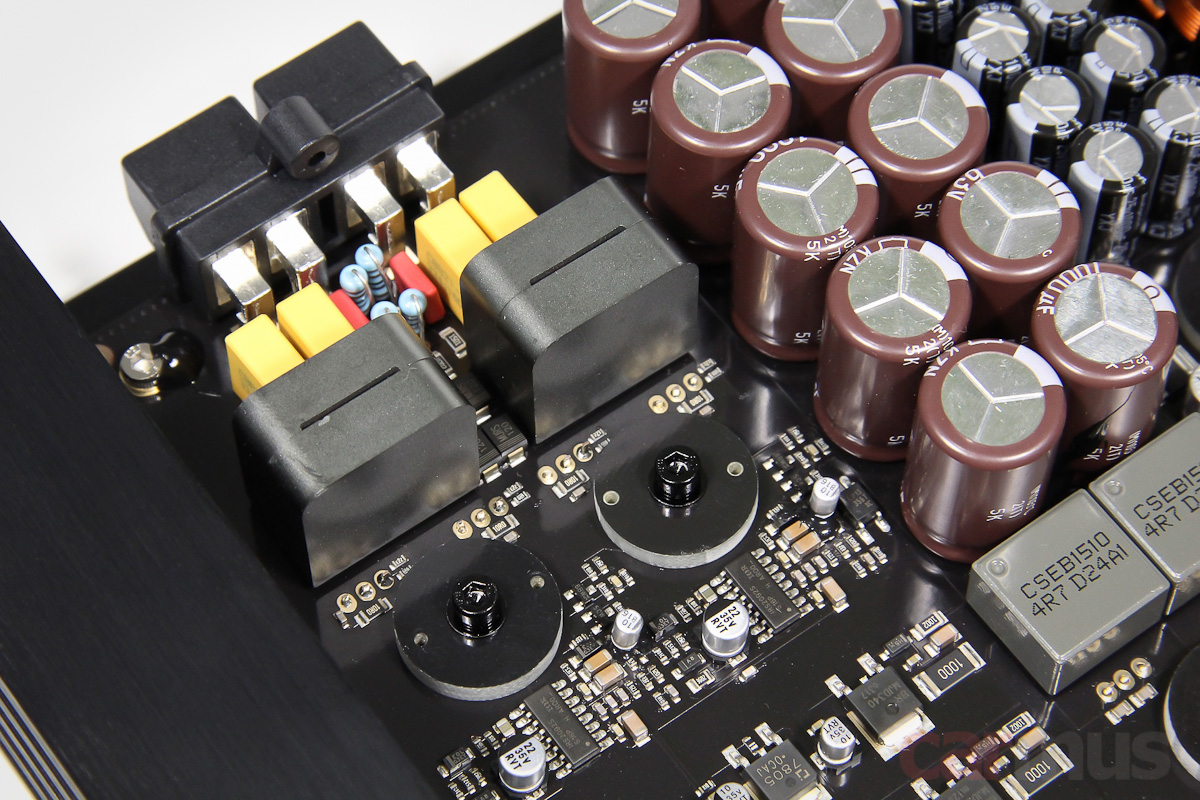 Общая площадь охлаждения не выглядит слишком большой, и, забегая вперёд, с такой приличной мощностью усилитель действительно не вот прямо холодный. Но и утюга из себя не изображает, так что если обеспечить хотя бы минимальную конвекцию, то проблем не предвидится, КПД у V Two достойный.
