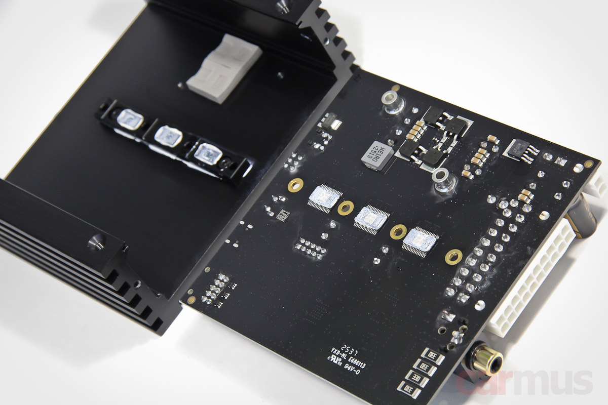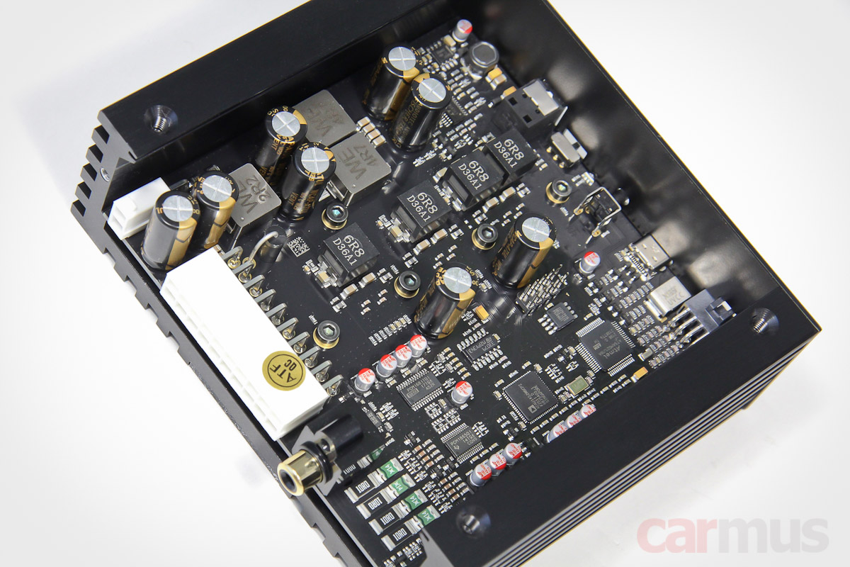 Вся начинка скомпонована на одной общей плате. В описании говорится о применении, дословно, «технологии усиления класса GD с динамически управляемым блоком питания». Впрочем, о том, что БП здесь построен не по шаблонным схемам, можно судить хотя бы по слабому нагреву корпуса — в обычных усилителях он греет корпус куда как сильнее.