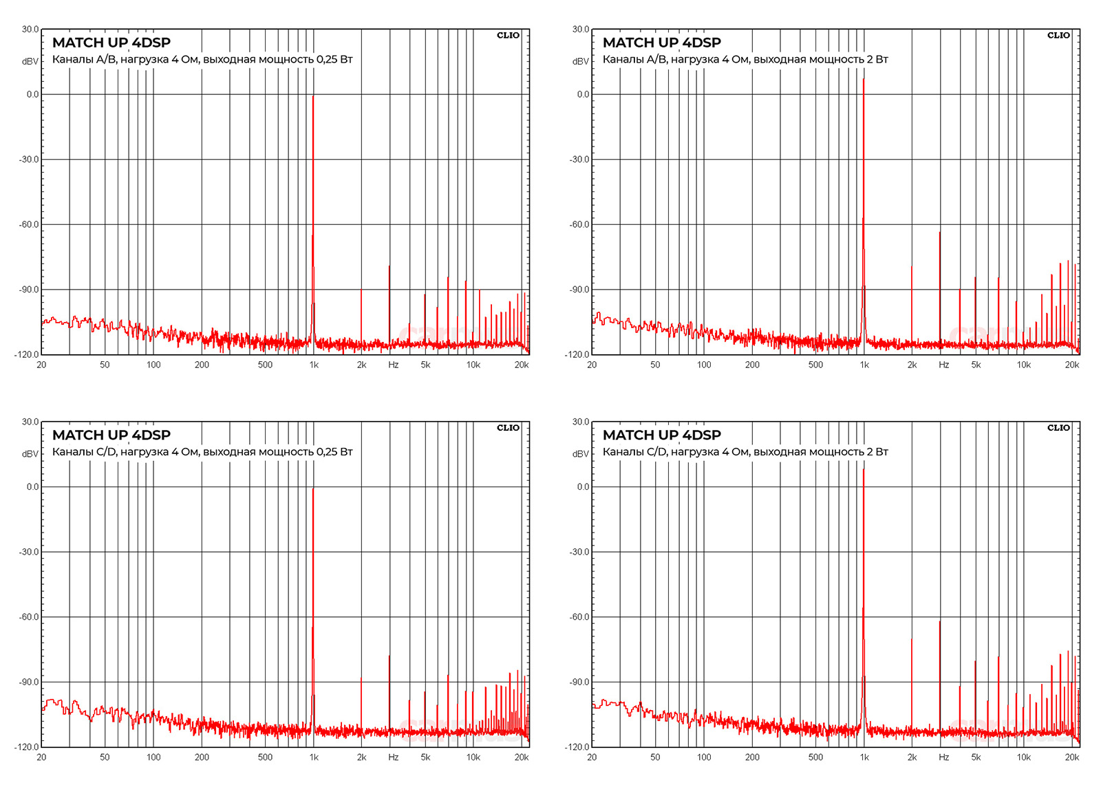 При выходной мощности 2 Вт разница между основным тоном и гармониками составляет около 70 дБВ, что соответствует КГИ в районе 0,03%. Кстати, ровно так, как обещает описание. При этом на малом сигнале разница ещё больше, т. е. КГИ не возрастает, как это чаще всего бывает, а напротив — ещё меньше.