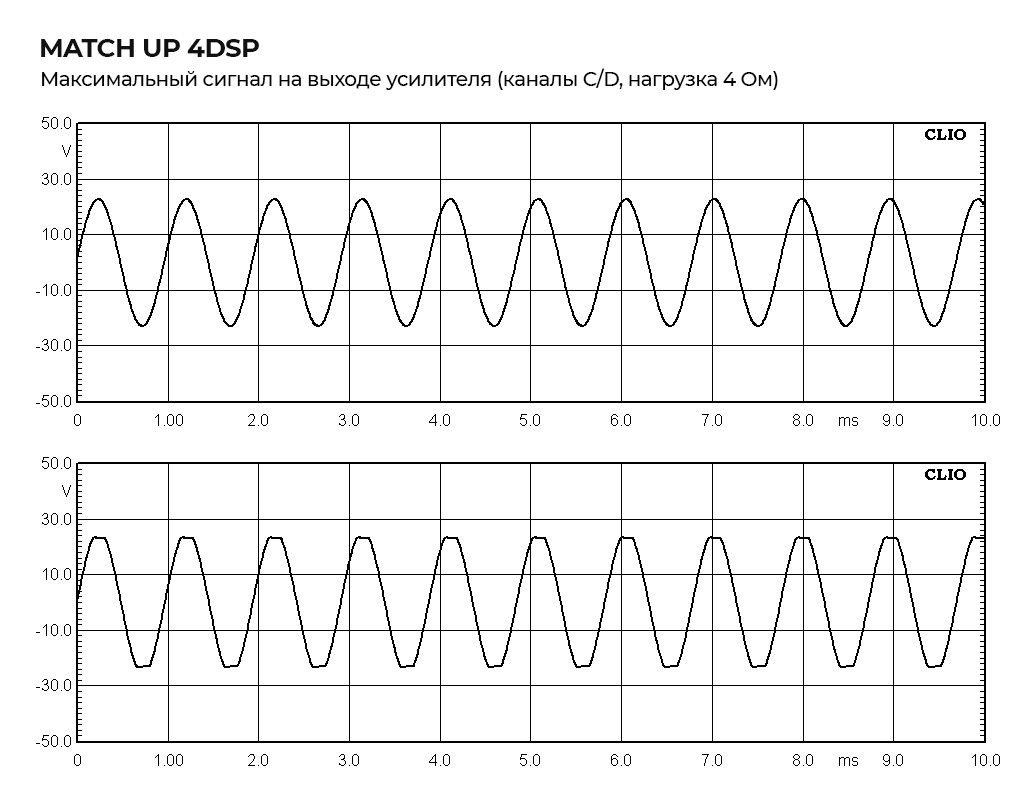На 4-омную нагрузку в обеих парах каналов ограничение начинается одинаково — при достижении примерно 23,5 Вольт. Это даёт неискажённую выходную мощность около 69 Вт RMS.